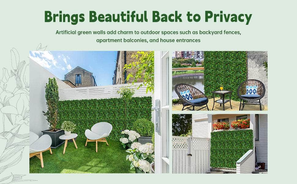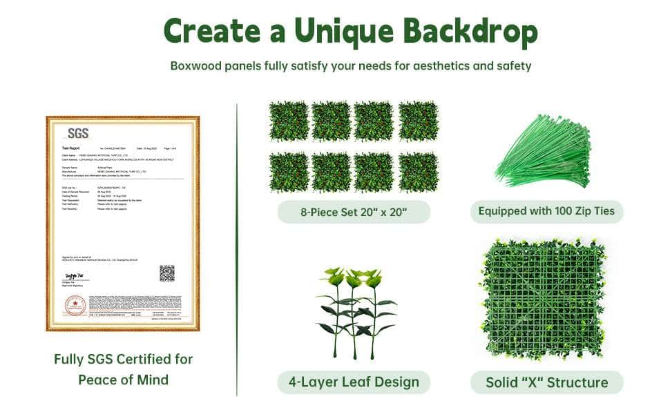 🍀LOWER MAINTENANCE: The packet included 8 packs of 20x20-inch fence panels and 100 zip ties, covering 22 sq. ft. Unlike real plants, our artificial green living wall never needs watering, pruning, or upkeep. They maintain a consistent color and lush appearance throughout their long lifespan.