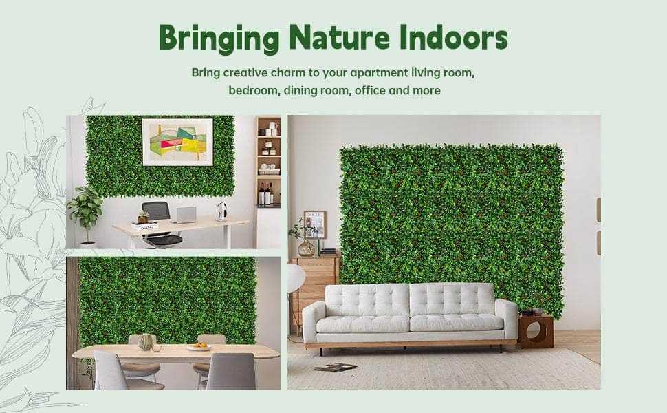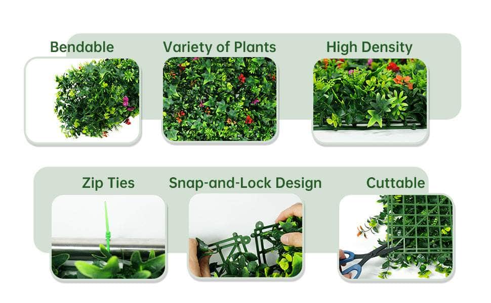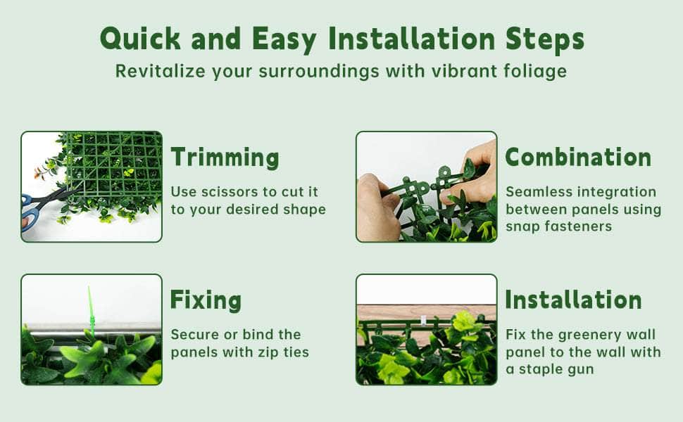 🍀SEAMLESS INTEGRATION: Snap, snap, done! The faux greenery wall panels can be swiftly installed anywhere you desire. With a clever snap-and-lock design, assembly is a breeze. X-shaped supports are included in the backing to provide extra reinforcement. You could easily cut it with scissors to the needed size.